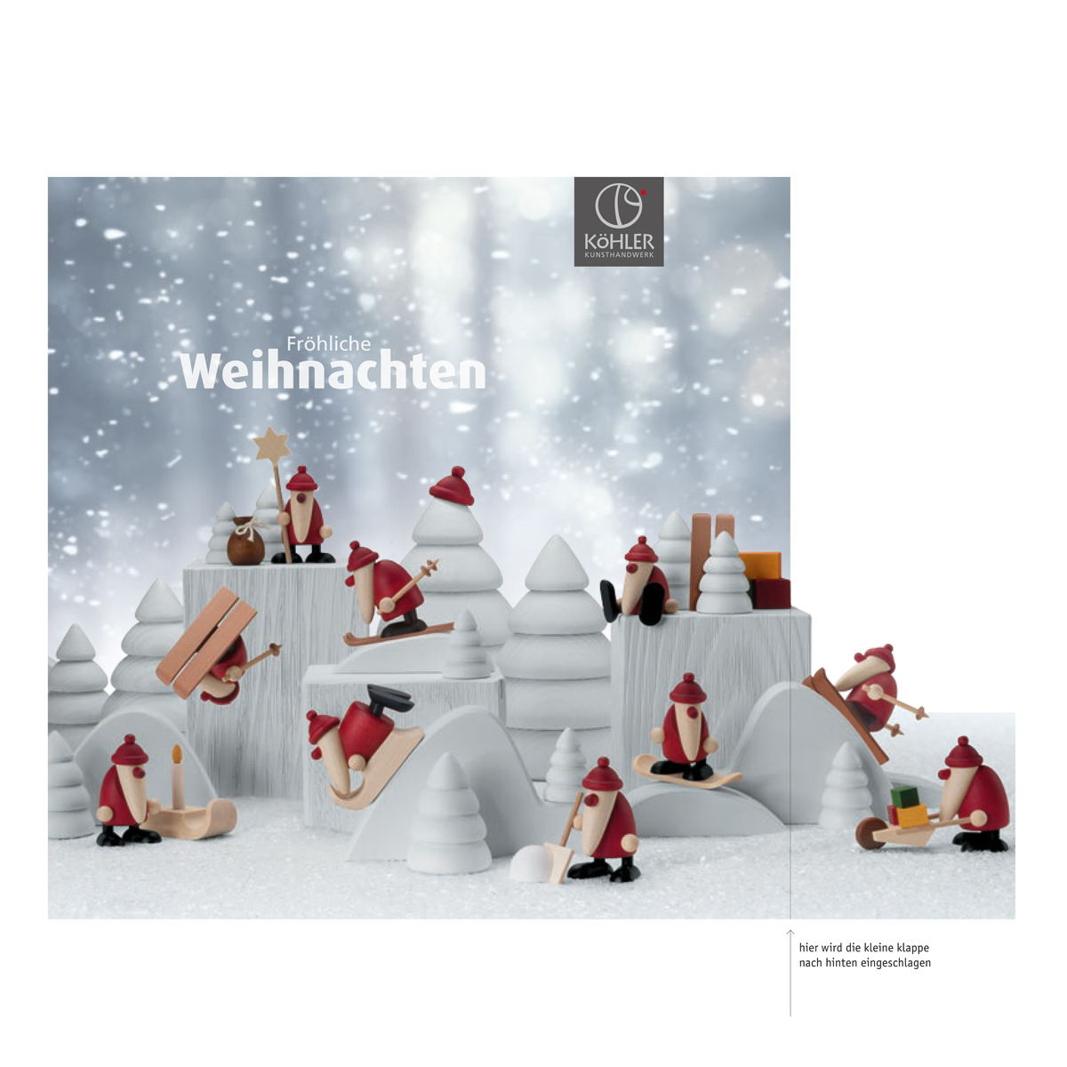 Die Karte besteht aus zwei Teilen – der quadratischen Weihnachtskarte (starker Karton) und dem konturgeschnittenenen Motiv der kleinen Weihnachtsmänner in der Schneelandschaft. Durch das konturgeschnittene Motiv kann die Karte als winterlicher 3D-Aufsteller für die heimische Dekoration genutzt werden. Dazu wird die kleine linke Klappe (diese ist für den Versand nach hinten umgeschlagen) bündig am Rand der Karte positioniert und mit dieser verklebt. Ein Selbstklebestreifen ist auf der Rückseite der kleinen Klappe bereits aufgespendet. Die Rückseite ist als Weihnachtspost beschreibbar, die Karte wird im Umschlag geliefert.
