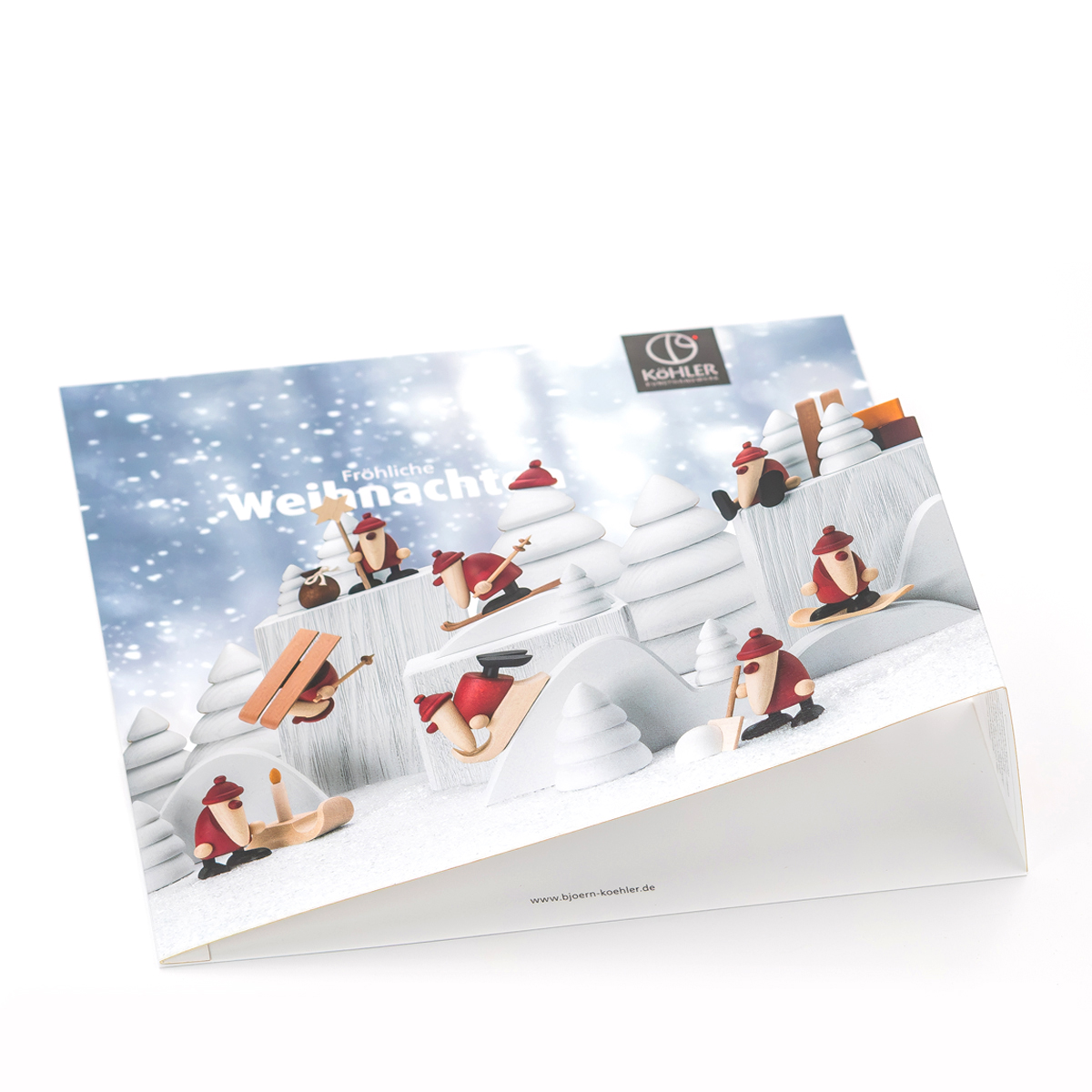 Konturgeschnittene Weihnachtskarte, die unter Mitwirkung des Empfängers zu einem kleinen, winterlichen Festtagsaufsteller wird.