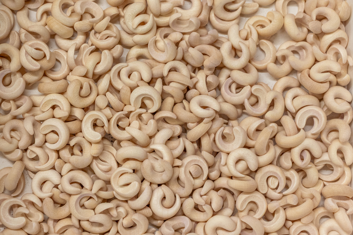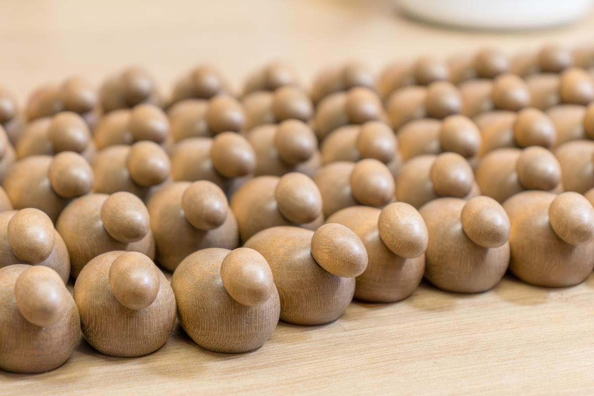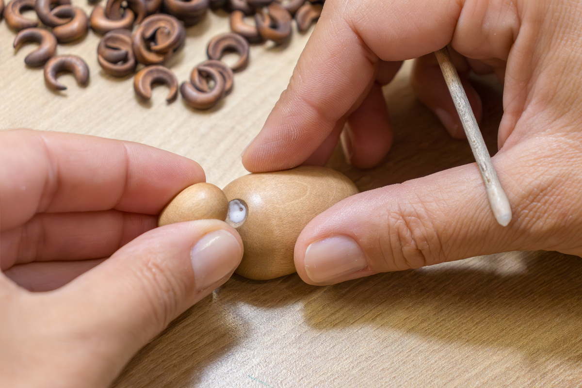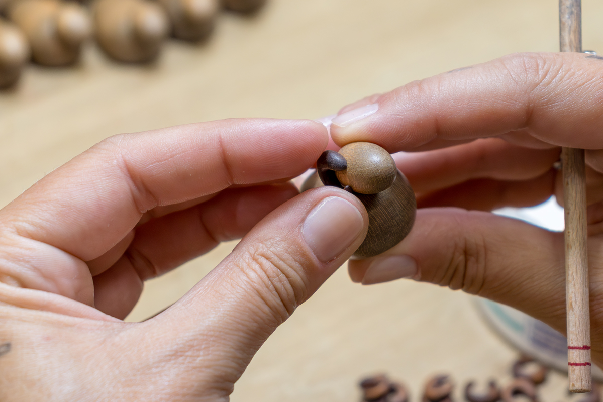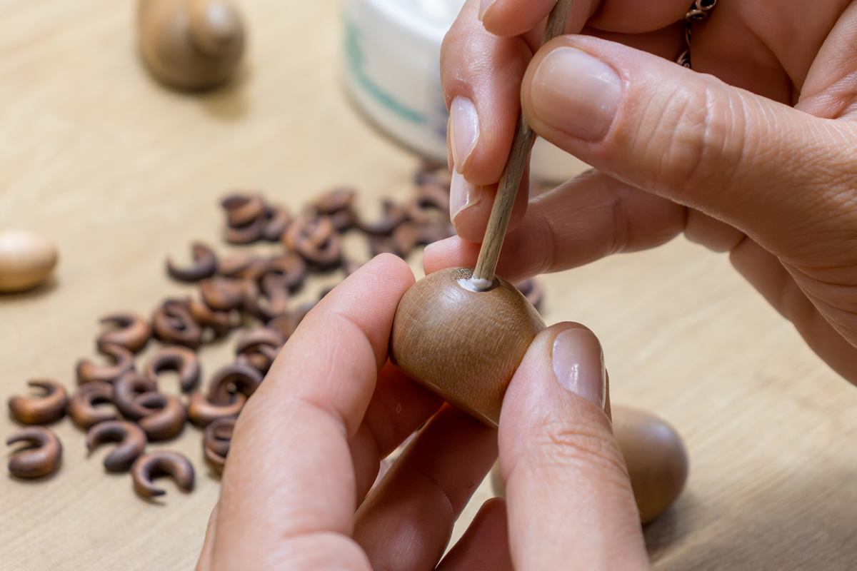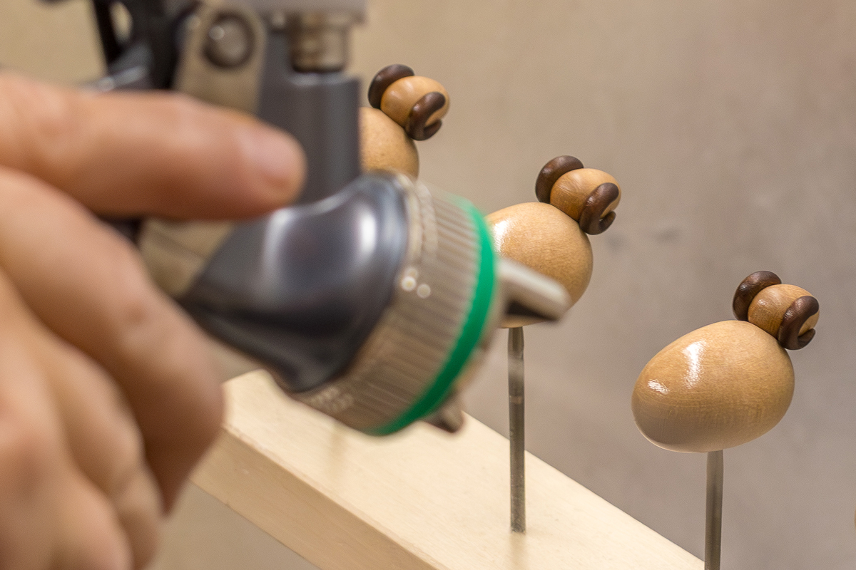 Die Körper der Widder entstehen aus feinem Ahornholz. Sie werden gedrechselt und an einer Stelle leicht angeschnitten, damit sie uns später auf dem Tisch nicht wegkugeln. In jedes Körperchen bohren wir eine kleine Kehle, in der der Kopf seinen Platz findet. Nach dem Einkleben wird er sorgfältig ausgerichtet, so schaut am Ende jeder Widder ein wenig anders in die Welt. Handarbeit eben.