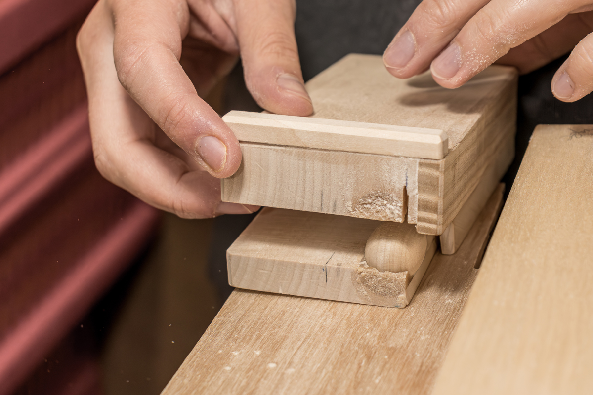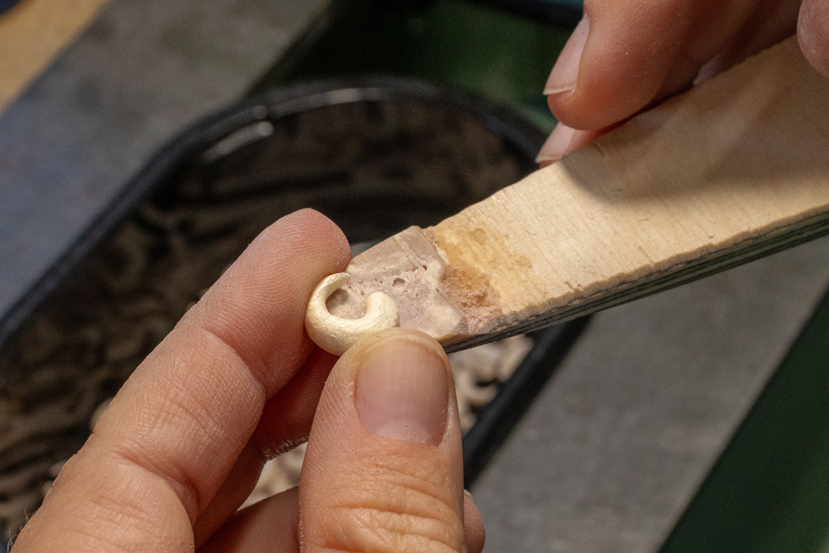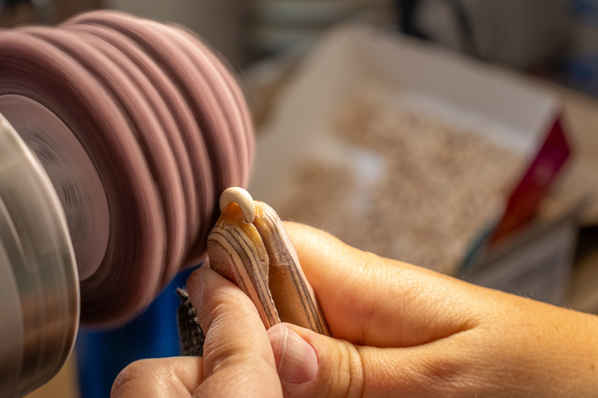 „Die kleinen Hörnchen (es gibt linke und rechte!) werden zunächst mit einer Kopierfräse grob vorgefräst. Anschließend schleifen wir jedes einzelne Horn von Hand in zwei Arbeitsschritten fein glatt. Damit wir die Teile gut halten können und um unsere Fingernägel zu schonen, haben wir spezielle kleine Klemmvorrichtungen entwickelt. Schon in der Vorbereitung von diesem Arbeitsschritt stecken mehrere Tage Arbeit.