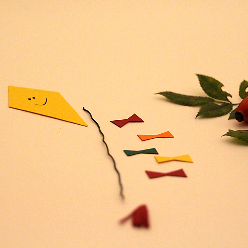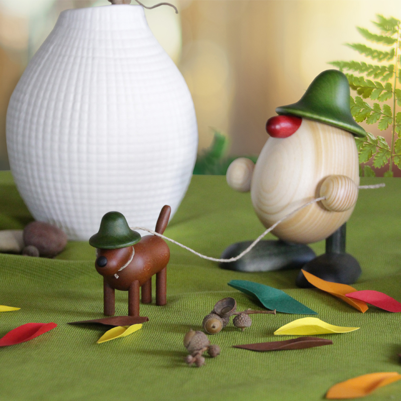 Mit dem Zweig geht’s genauso. Blätter aus Tonkarton zurechtschneiden, etwas anknicken, an den Zweig kleben und diesen in eine kleine Vase stellen. Die übrigen Blätter und ein paar Herbstfrüchte dazulegen. Mit unseren Figuren und der selbstgemachten Deko lässt sich so ein fröhliches Herbstbild zaubern. Viel Spaß dabei.