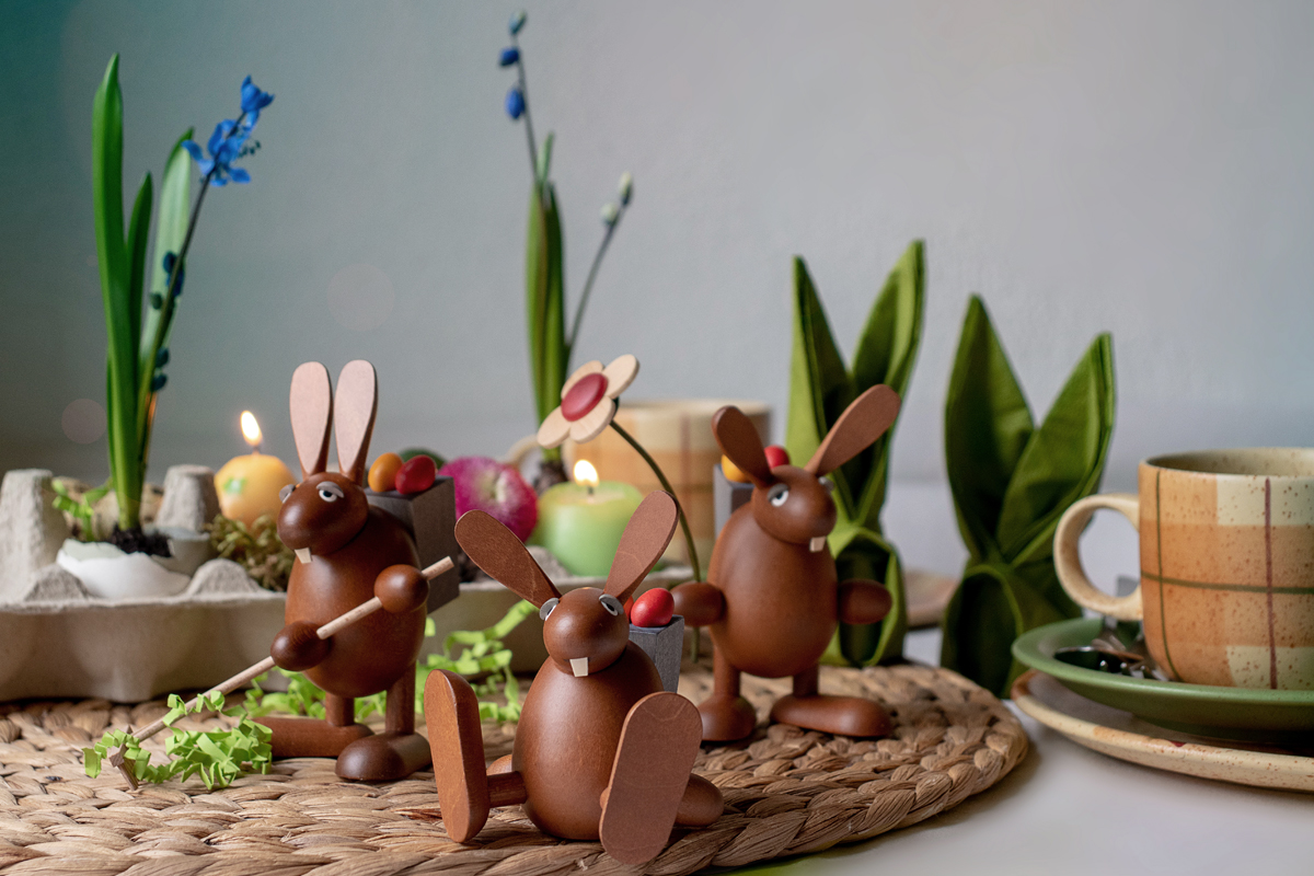 Unsere Ideen für frische Dekoration sind einfach nachzugestalten. Mit unseren Hasen, etwas Ostergras, oder Heu, ausgeblasenen Eiern und einem schönen Tischläufer entstehen im Handumdrehen stimmungsvolle Szenen.