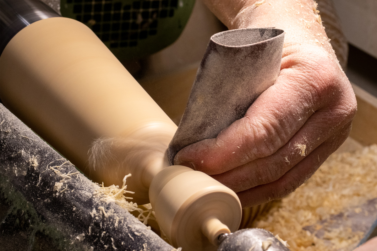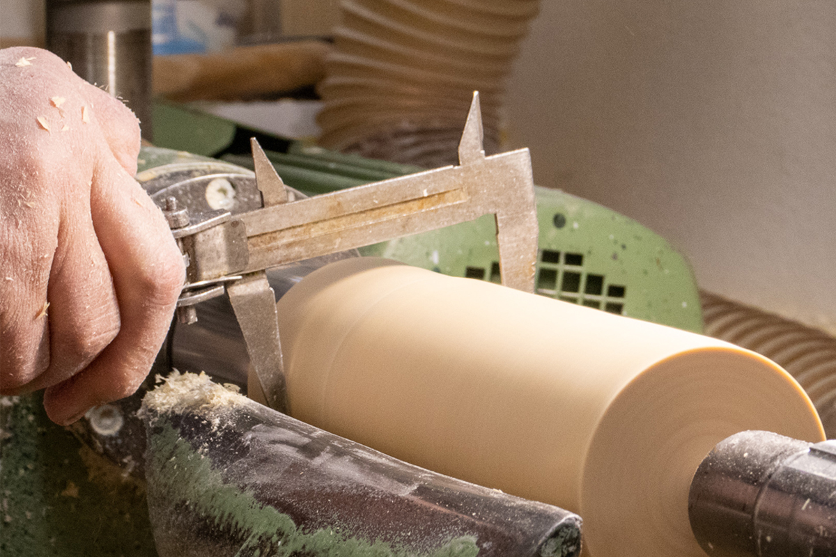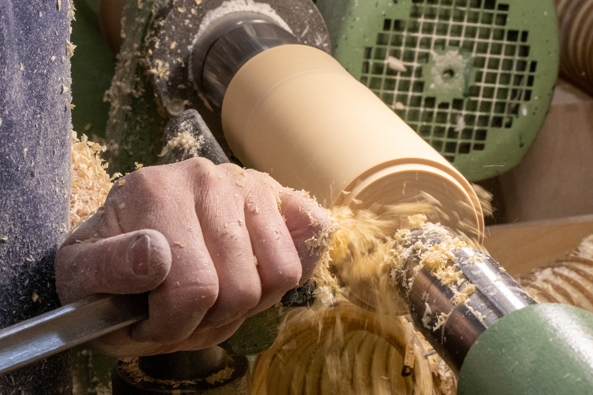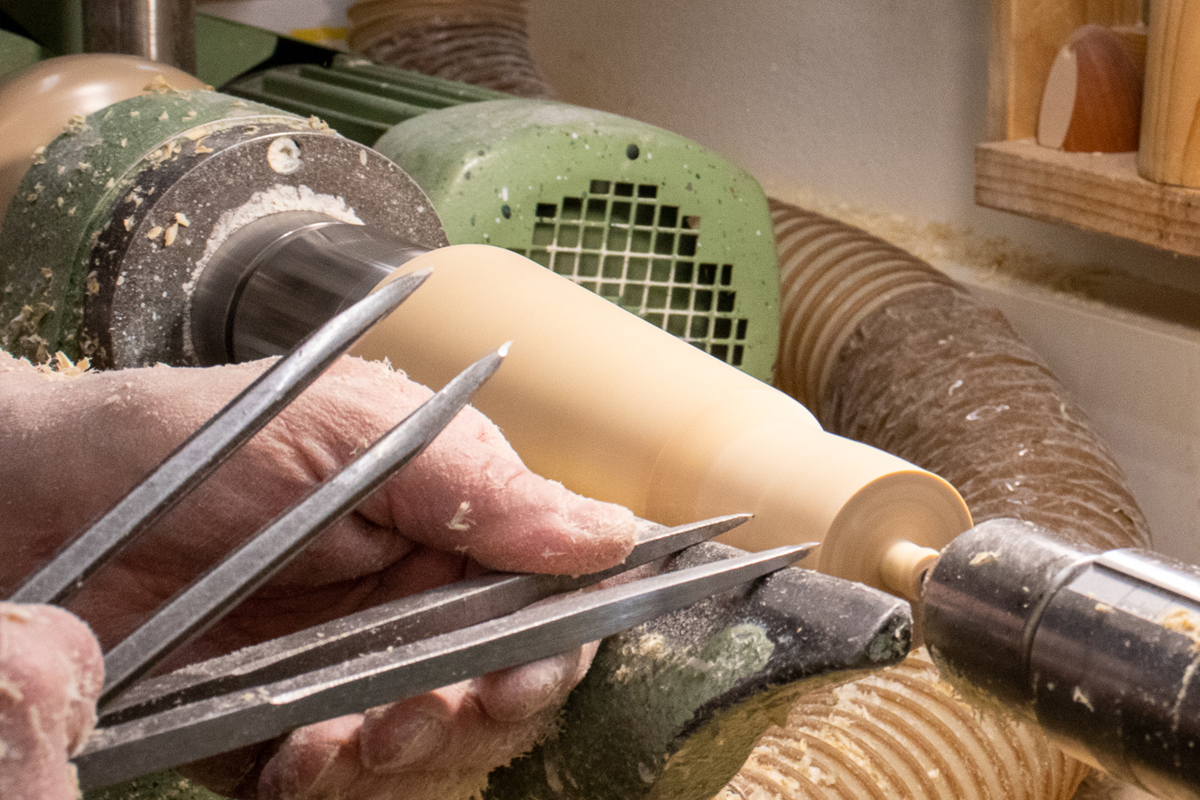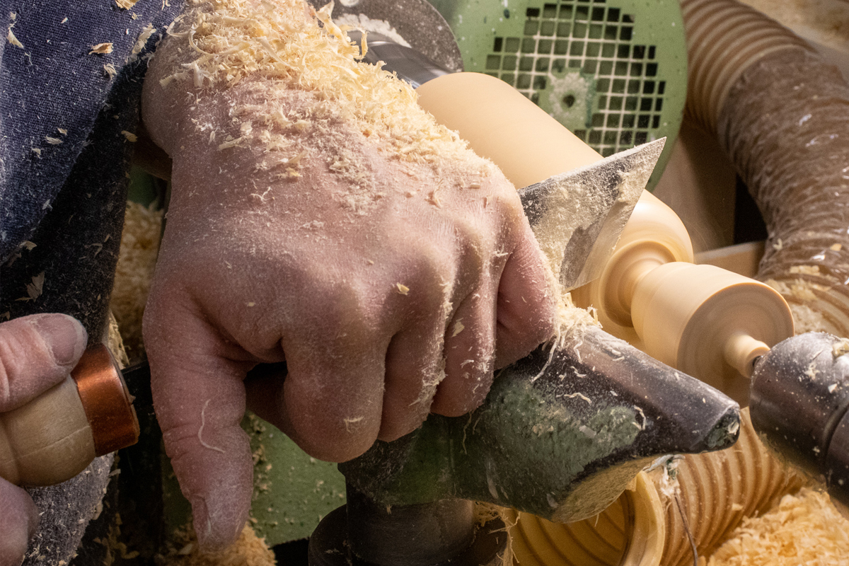 Die Lichterengel aus unserer Werkstatt sind in Anlehnung an die traditionellen erzgebirgischen Weihnachtsengel von der Krone bis zum Fuß aus einem Stück Fichtenholz, auch Docke genannt, gedrechselt. Dazu braucht es geübte Hände und einen sorgsamen Blick, denn ihre klare, erhabene Form korrespondiert aufs Feinste mit der Maserung des eigens dafür ausgesuchten und lange gelagerten Fichtenholzes.