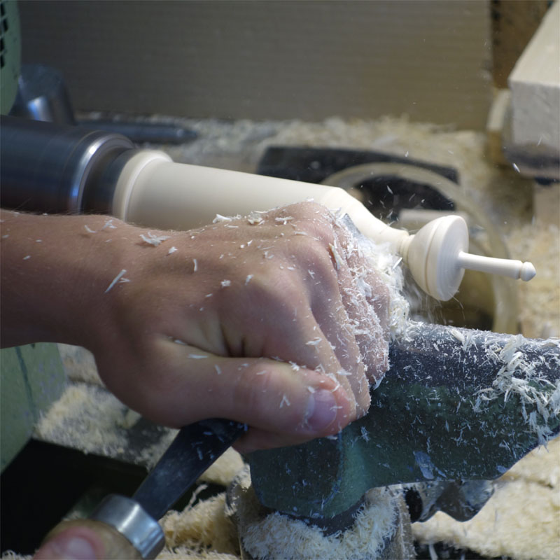 Wer unseren Mitarbeitern schon einmal beim Drechseln über die Schulter geschaut hat, weiß, mit welcher Leichtigkeit geübte Hände die typischen Formen unserer Produkte aus dem Holz herausarbeiten. Der Umgang mit Röhre und Meißel wirkt souverän, ja geradezu spielerisch.