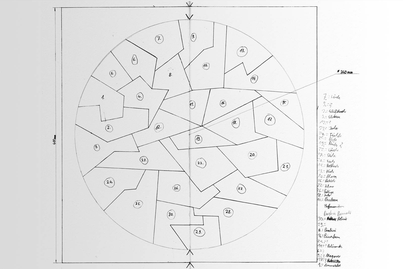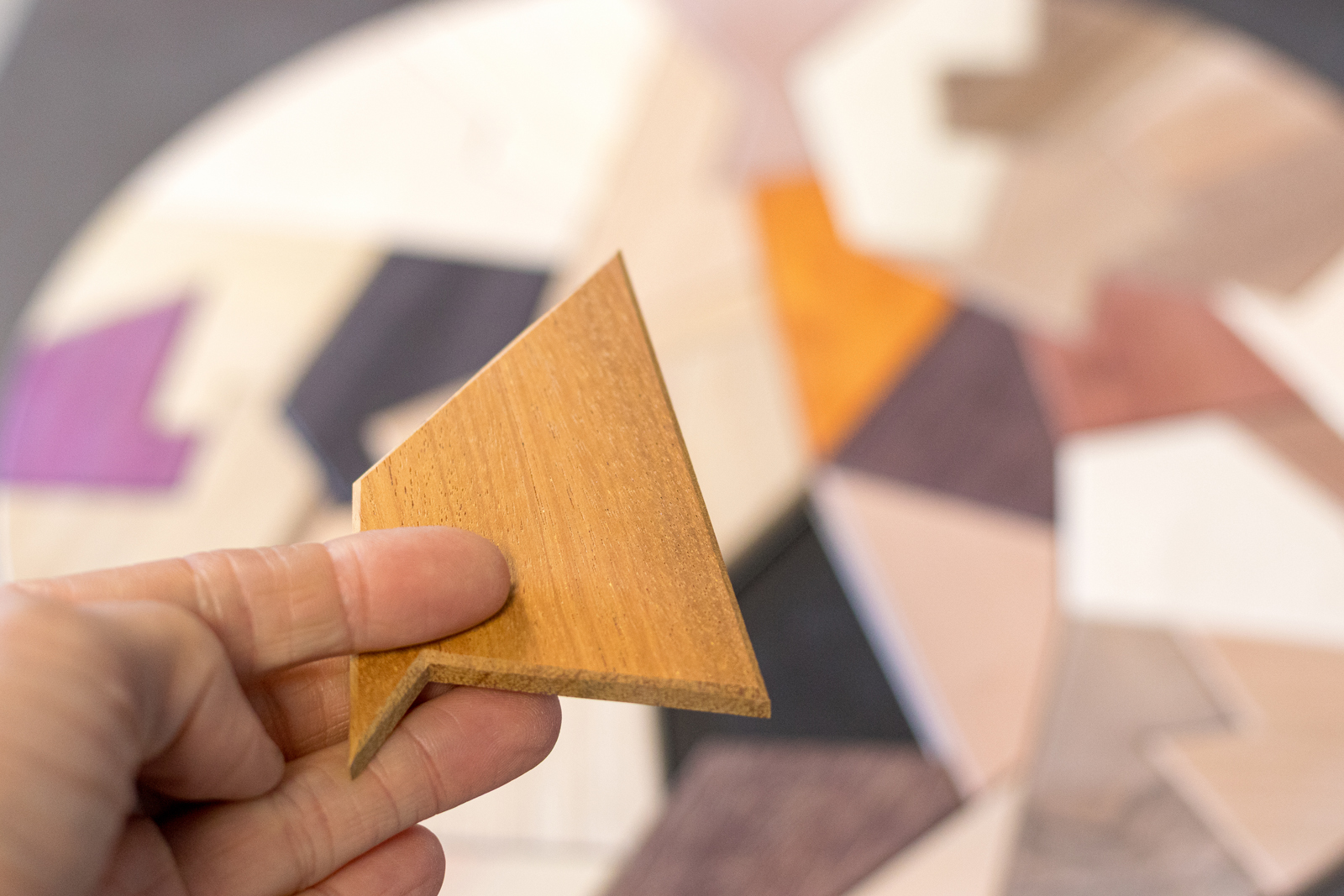 Für die Umsetzung hatte er weitgehend freie Hand. Nach dem Aufzeichnen der Mosaikteile, suchte er nach verschiedenen Umsetzungsmöglichkeiten, damit am Ende alles passt und gut miteinander harmoniert. Die mit der Bandsäge ausgeschnittenen und angefasten Puzzlestücke wurden rückseitig mit Magneten versehen, sodass sie leicht aus dem Rahmen herausgenommen und wieder eingesetzt werden können.
