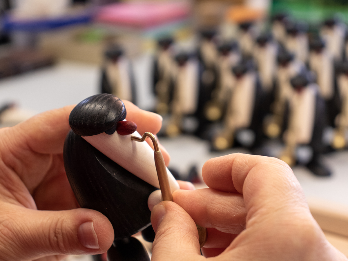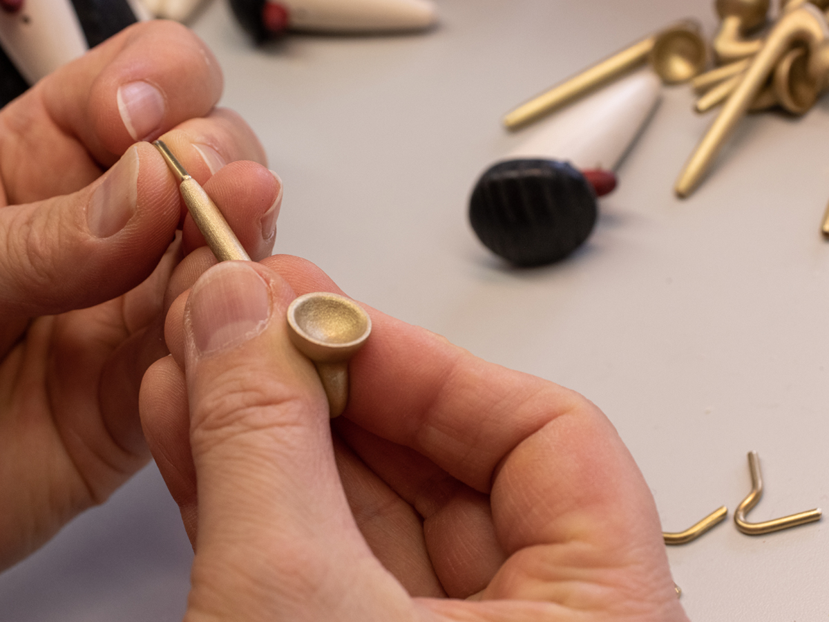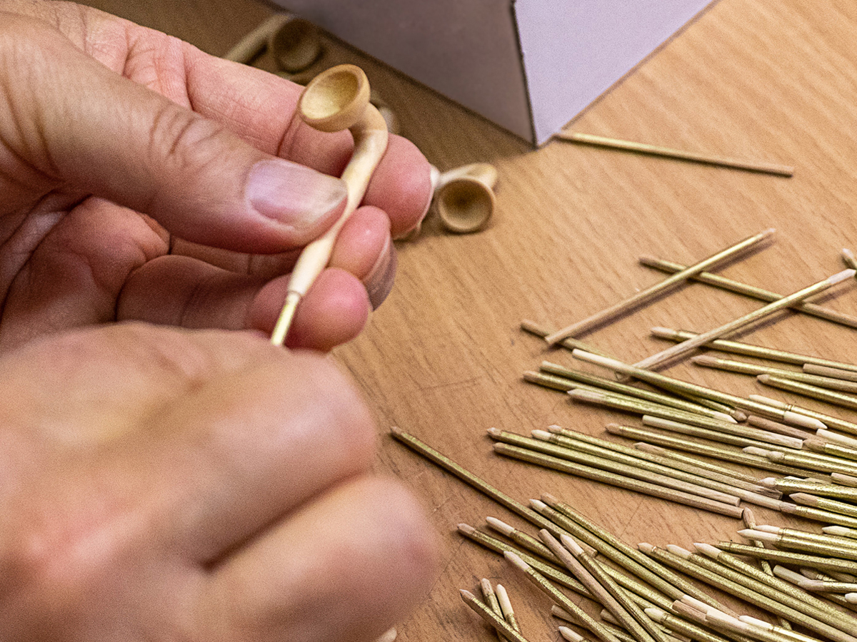- Zuletzt erhalten die Instrumente einen feinen, matt-satinierten Überlack. Nach der Trocknungsphase wird jedem Instrument das Mundstück am oberen Korpusende in die vorbereitete Bohrung eingeleimt und einem passionierten Musiker in die Hand gegeben.