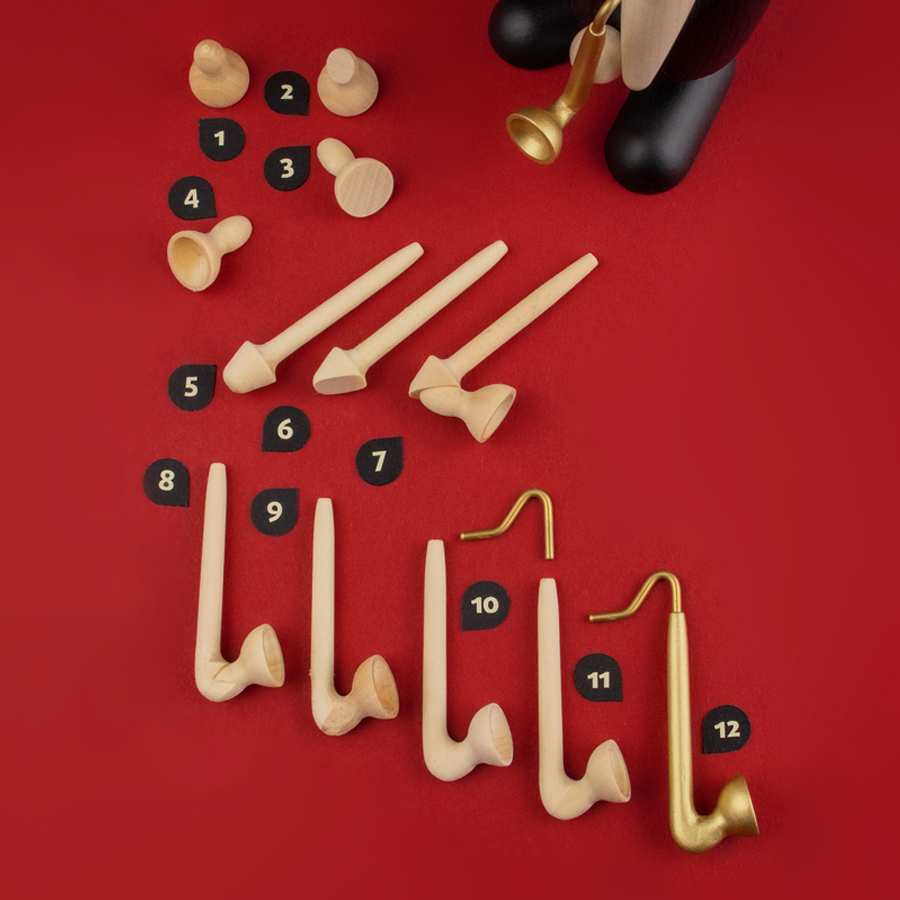 X-beliebig ist hier nicht zutreffend – denn handwerklich gesehen ist das Saxofon ein herausragend gefertigtes Instrument. Dem wollen wir Kunsthandwerker natürlich in nichts nachstehen. Unser Saxofon ist ein echtes Holzinstrument, gefertigt in einundzwanzig Arbeitsschritten, die wir anhand des nummerierten (rot hinterlegten) Bildes erklären.
