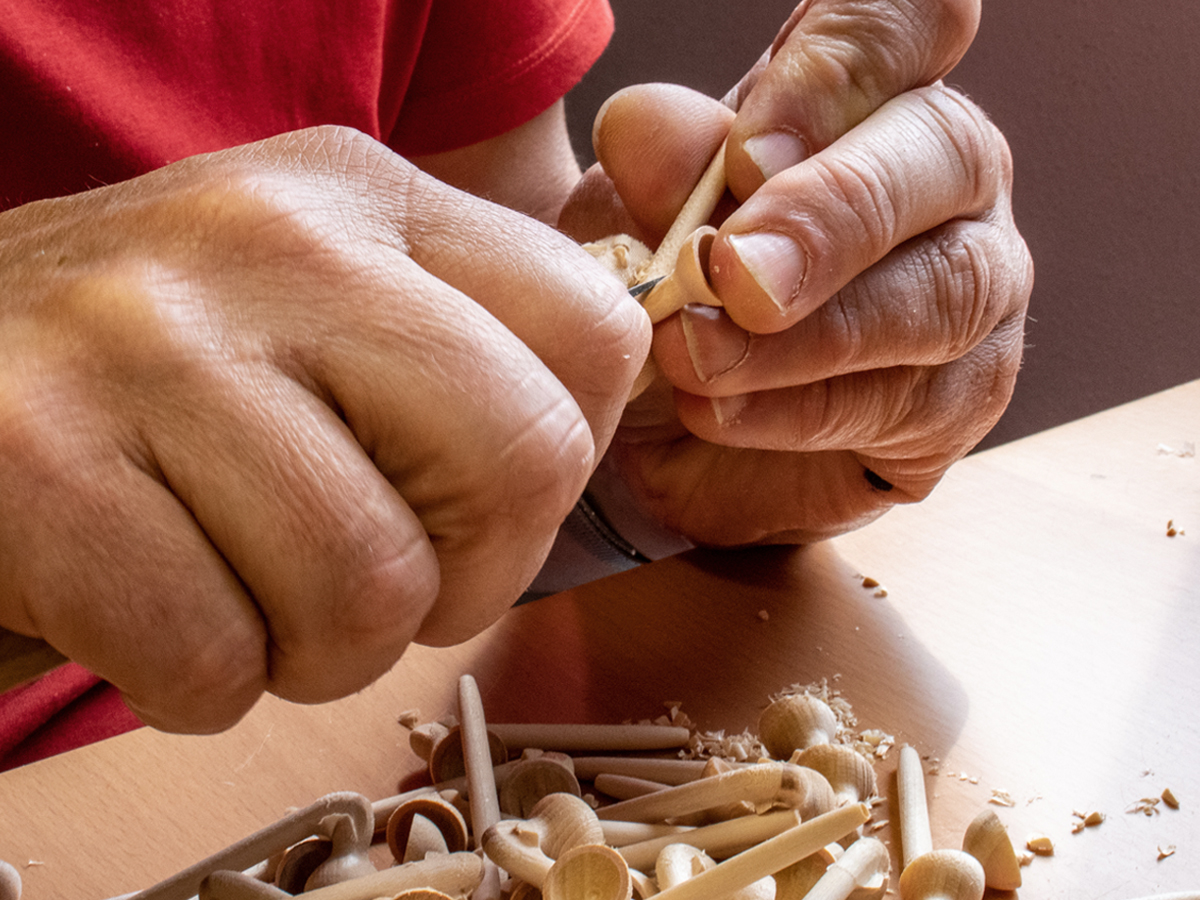 - Im nächsten Arbeitsgang wird der Schall schräg angeschnitten, damit die typische hakenförmige Krümmung entsteht.