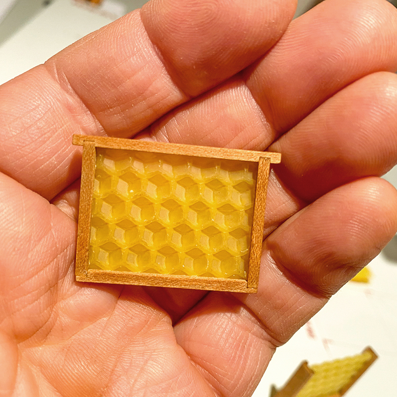 Herausfordernd in besonderem Maße waren bei der Herstellung die hochfiligranen Figurenteile, die für die Manufaktur eher untypisch sind. Dafür kamen viele kleine Lehren und besondere Fertigungstechniken zum Einsatz. Insbesondere der Zuschnitt des Wabenrähmchens, in dem eine echte Bienenwachswabe klemmt, forderte den Tischlern höchste Konzentration ab. Ebenso alle Schritte zur Entstehung des Insektes.