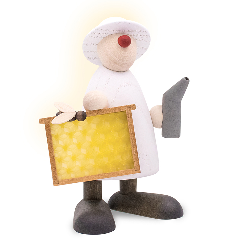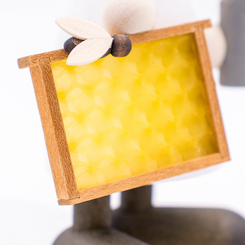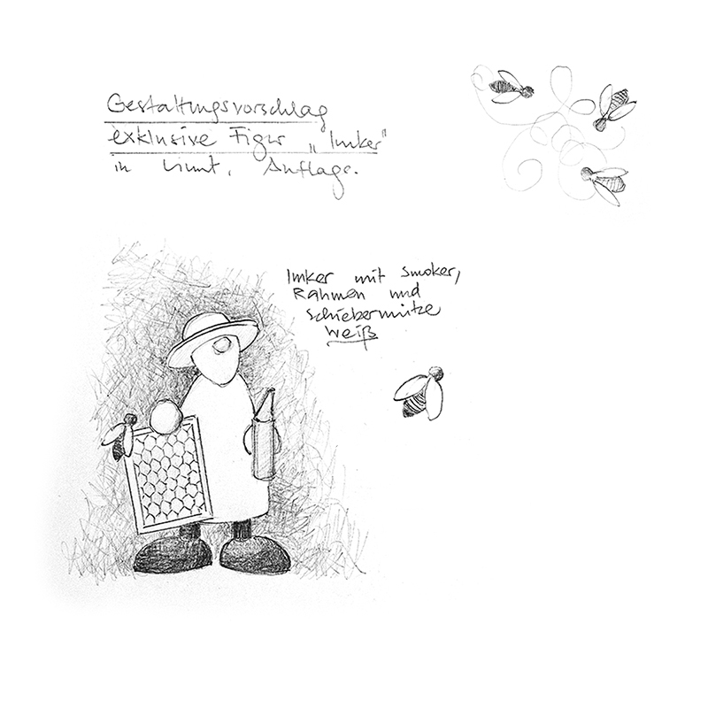 Schon beim Entwurf war Björn Köhler klar, dass für den Gesamteindruck einer Imkerfigur besondere Details essenziell sind. Und so ließ er eine außergewöhnliche Komposition von der ersten Idee bis zum letzten Fertigungsschritt entstehen; aus natürlichen Rohstoffen, mit berufstypischer Kleidung und speziellem Arbeitsgerät.