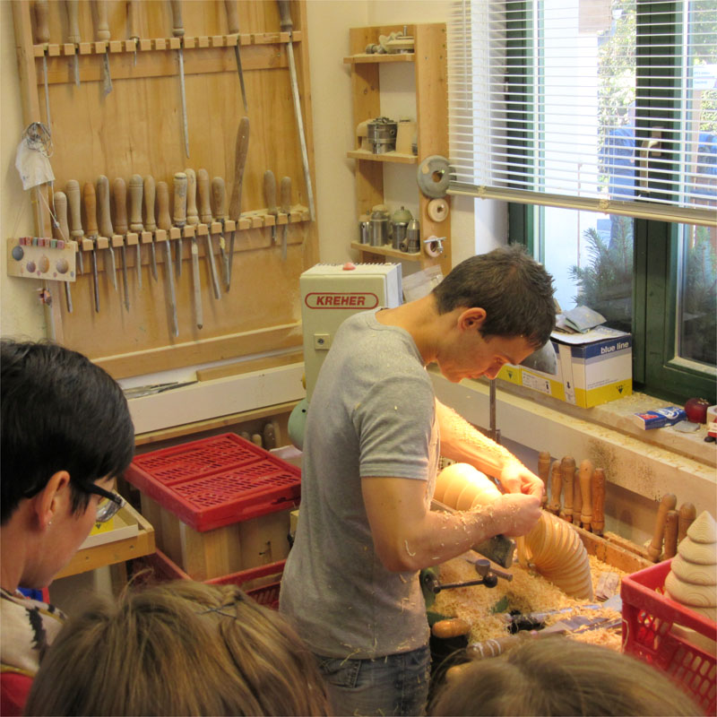 - Auf dem Hof wird an einer historischen Holzdrechselbank gearbeitet. Kinder haben zudem die Möglichkeit, unter Anleitung aus verschiedenen Holzteilen selbst kleine Kunstwerke zu erschaffen.