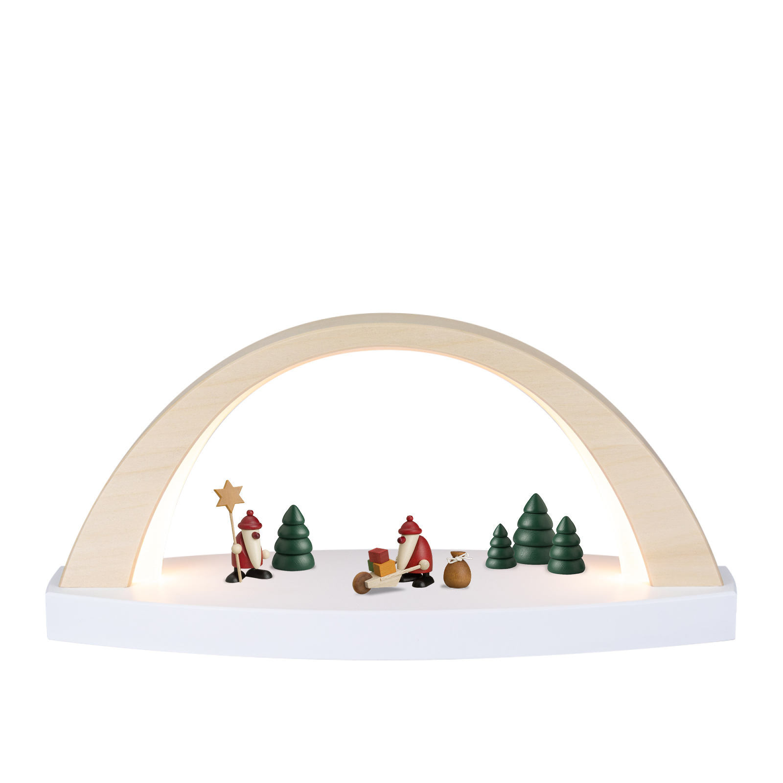 The arc is powered by the latest generation of LEDs. It is characterized by extremely low energy consumption and a pleasant warm white light color. The light shines softly inwards onto the base through a specially cut art glass insert, creating an impressive setting for the figures displayed in the arch.