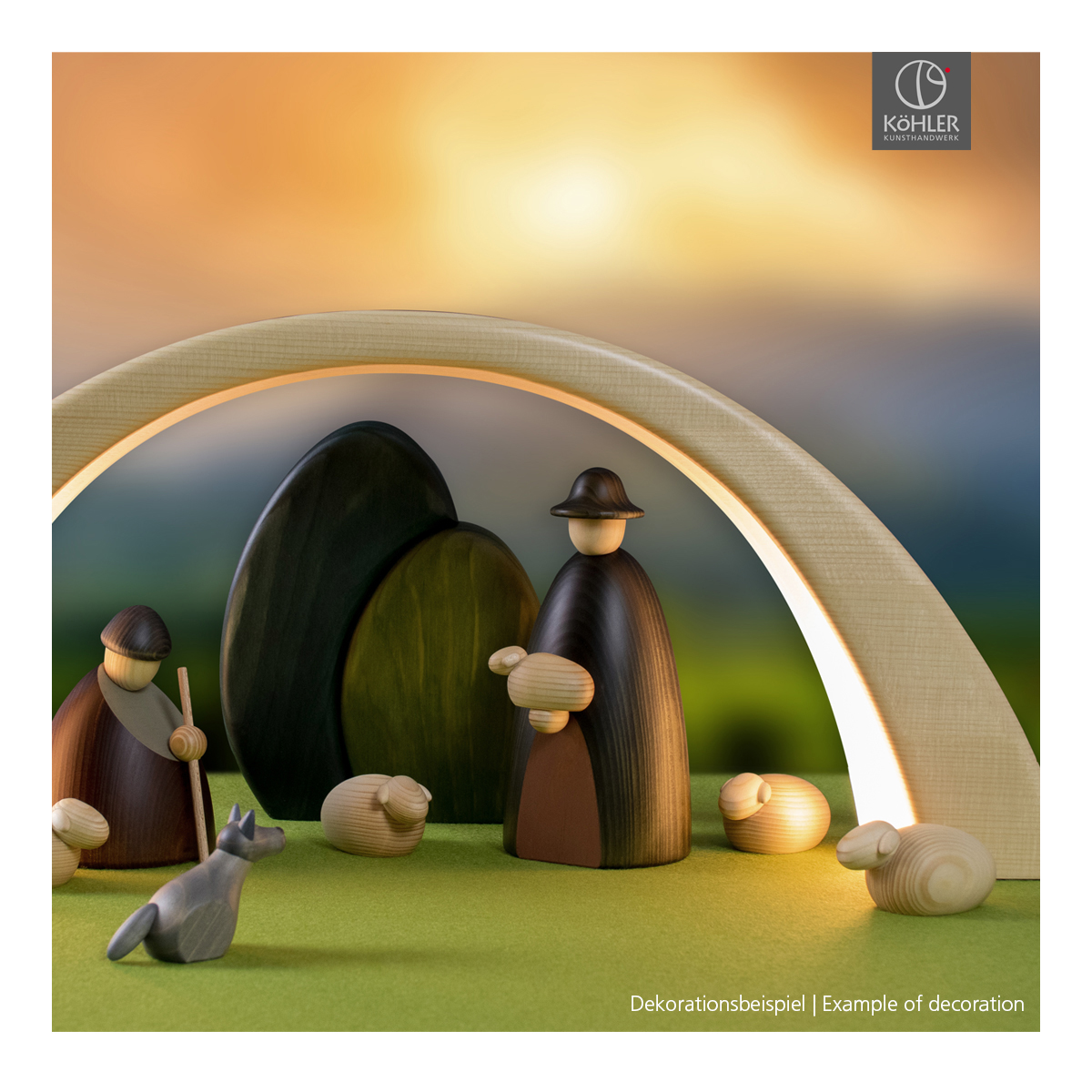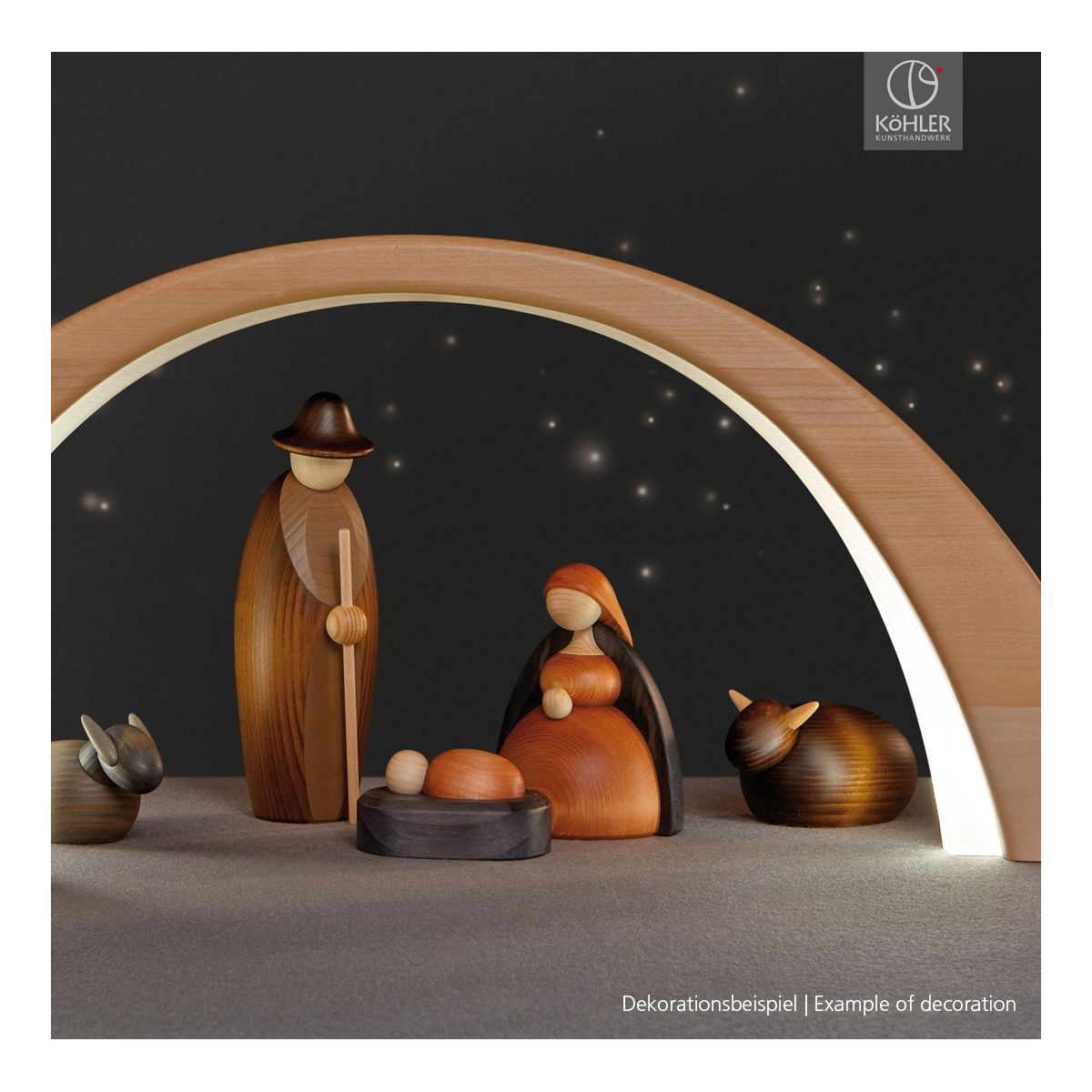 These LEDs stand out due to their extremely low power consumption, pleasant warm-white light colour and service life of approx. 50,000 hours. This new candle arch represents yet another high-quality product in the range available from the Köhler brand. Its specially cut acrylic glass insert enables the light to softly shine inside the arch, thus creating an impressive setting for the figures displayed in the middle. The arch, which is supplied with a mains adapter ready to be plugged in, features an integrated jack plug for hidden cable routeing (e.g. though the rear panel of a shelf).