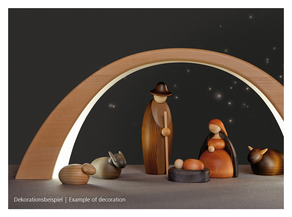 Large version of the coloured Nativity scene, consists of: Nativity scene (Joseph, Mary and baby Jesus, item 310), The shepherds with two sheep (item 320), The Three Wise Men (item 330), Ox and Donkey (item 340), Candle Arch (item 8640)
